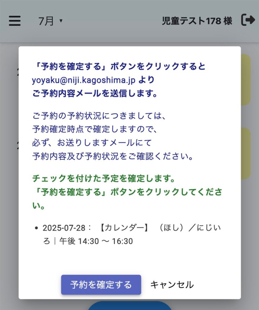 ⑤予約内容メール送信と予約確定画面が出てきます、内容を確認して間違いがなければ「予約を確定する」を押して下さい。